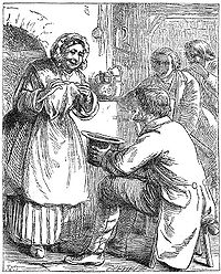 Однажды утром явились люди прибрать чердак. Ящики были вытащены, а за ними и ель. Сначала ее довольно грубо бросили на пол, потом слуга поволок ее по лестнице вниз.