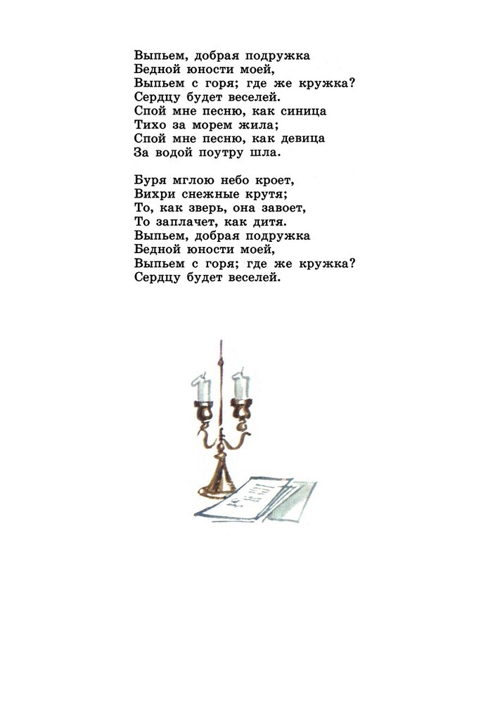 Только няня Арина Родионовна скрашивала это тяжелое для поэта время, разделяя с ним его тоску и одиночество, и продолжая заботиться о нем, как в детстве. Эту идиллию длинных зимних вечеров рядом с преданной няней нарушает печальный, суровый зимний пейзаж. И непонятно, где этот холод сильнее, там за окном или в душе Пушкина. Поэтому, чтобы хоть как-то развеять свою грусть, поэт обращается к няне со словами: «Выпьем, добрая подружка бедной юности моей».