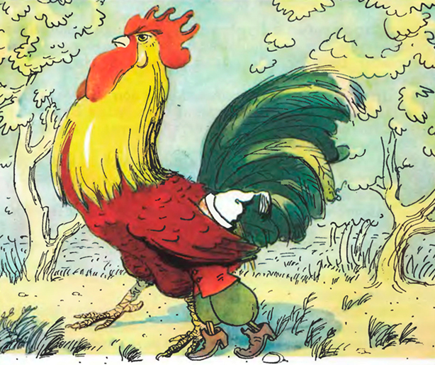 — Эй, слуги! Хватайте петуха! Рубите его саблями!Побежали слуги сабли точить, а петушок барину покою не даёт: сел ему на голову и давай в темя клевать.